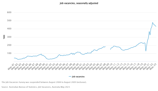 再看劳动力市场,此前我们反复提到澳联储最为担忧的就是薪资物价螺旋效应,劳动力市场紧张,市场缺乏劳动力,工资水涨船高推动物价不停上涨,使得通胀问题无法被解决。这个数据近期终于迎来好消息,截至 2023年5月的三个月,2023年5月有432,000个职位空缺,职位空缺减少了 2.0%(9,000 个职位空缺),连续第四个季度下降。此外,澳大利亚在未来的1-2年也将迎来大批的移民,帮助解决技术和劳动力短缺问题,舒缓本地企业的用工压力。