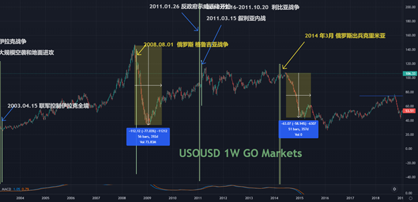 从各方的利益来看,美国无疑是此次战争中是最大受益者,让战争持续发酵会使美国的利益最大化,欧盟并不会有任何利益,欧洲40%的天然气都来自俄罗斯,如果俄罗斯的石油和天然气受到制裁,欧盟明年冬天怕是要烧柴取暖了。乌克兰最惨,连棋子都算不上,充其量是个棋盘,大国博弈下的炮灰。俄罗斯主要目的是让北约打消东扩的念头,如果战后还能扶植几个地区独立也是非常乐意看到的,至于经济制裁,俄罗斯受到西方制裁也不是一天两天的事了,此次制裁普京肯定早有预料。综合来看,各方利益极其复杂,并且普京的铁腕,和美国创纪录的通胀也是公认的事实,因此,接下来事态如何发展真的是很难预料,我做不了专业的军事分析,但是,金融市场没有新鲜事,历史总是在不断重复,今天我们就来看看原油市场有什么历史性的巧合。先说结论,每次俄罗斯发动战争之后,原油的价格都会出现回落,并且,都是从高位回落。战斗民族好战,我们就选取比较有代表性的三次战争,来回顾油价的走势,最后,有时间的话我们再来看看有美国的影子的战争对于原油价格会有怎样的影响。按照时间顺序,1979年12月底,前苏联入侵阿富汗,发动了长达10年的战争,1979年初,油价也就在15美元附近震荡,到了战争前夕,油价就上涨到了40美元附近,涨幅超过2倍。就在苏联入侵阿富汗之后,油价开始回落,随后的两年回落到了30美元附近,之后又开启了新一轮的上涨;