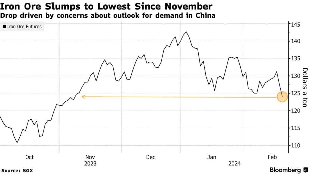 提到中国房地产,肯定必须聊聊澳洲铁矿石。房地产占中国钢铁需求的30%至35%,尽管中国房地产市场得到额外支持,但铁矿石价格仍跌至三个月低点,自 2024 年初以来,铁矿石现货价格已下跌 5%,至每吨 129.29 美元 。