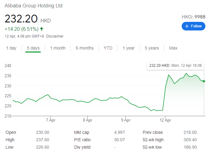 最近几天中文新闻头条都在说阿里被罚的事,相信昨天Jacky也和大家详细说到了阿里被罚的前因后果。但是这罚钱的新闻热度还没有完,在昨天的港股交易时间内,阿里的股价就已经上涨了6%,甚至在开盘的时候上涨达到了8%。