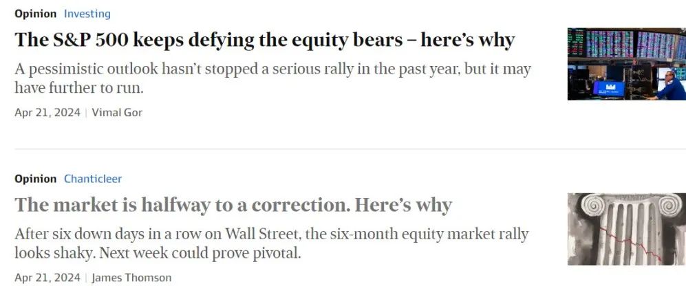 说回到专家意见,我今天就在澳洲最大的财经媒体,AFR网站上看到了奇怪的一幕:在同一天,同一个股市栏目下,竟然出现了上下两条完全不同意见的“专家分析”。我特地截屏下来给大家欣赏一下:第一条说美国股市继续推翻对其熊市的推论,就是说美股会继续上涨。然后在同一天,4月21号,就在刚才说美股会继续上涨的下面,另一个专家写的文章说,股市已经快要进入回调(下跌)了,并附带了原因。