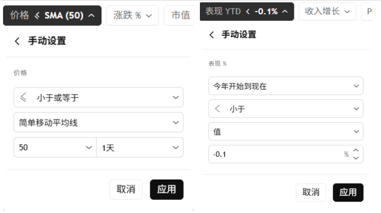 我们也可以设置更复杂的筛选条件,例如:如果我们希望找出近期在底部放量,且放量前处于下降趋势的个股,该如何操作?首先,可以设定两个基础条件,来判断股票是否处于下跌通道中:-股价小于等于50日简单移动平均线(SMA50),说明当前价格仍位于中期均线之下;-年初至今收益率为负,进一步确认这只股票今年整体处于下行趋势。