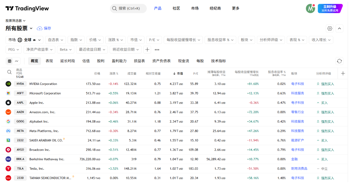 在这个信息爆炸的时代,炒股早已不是拍脑袋做决定的年代。面对成千上万只股票,如何从中筛选出真正有潜力的标的,成了每个投资者绕不过去的问题。靠消息?靠感觉?这些方法或许偶尔奏效,但注定难以长期稳定。这时候,一个强大的工具——TradingView,能帮你大大提升效率。作为全球领先的图表分析平台,TradingView不仅有丰富的技术指标和图形工具,更内置了强大的股票筛选器(Stock Screener),帮助你用数据说话、用逻辑选股。本文将带你一步步了解如何在TradingView上进行科学的选股操作,让你从海量股票中,快速定位符合你策略的优质标的。目前GO Markets已正式支持TradingView交易功能,连接账户后即可直接在图表上下单,省时又高效。还没体验过?快来注册一个试试吧!首先,打开我们的Tradingview筛选器平台:https://cn.tradingview.com/screener/