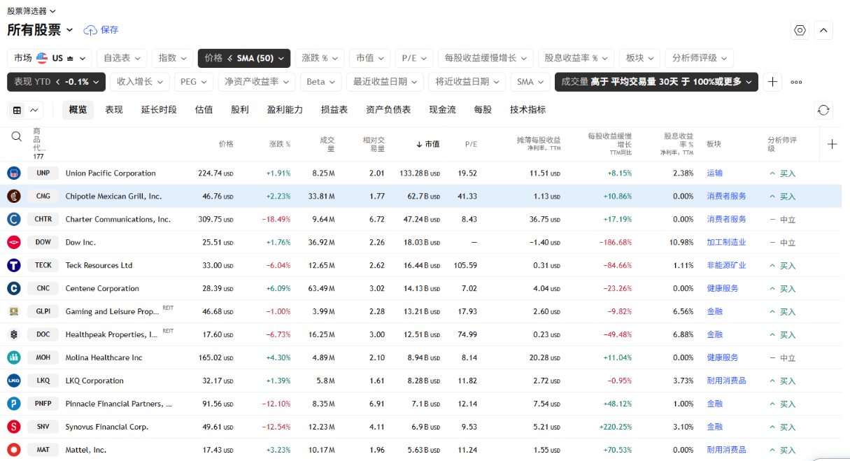综合以上三个筛选条件:1. 股价低于或等于50日均线,2. 年初至今收益为负,3. 最近一天成交量大于30日均量的两倍,我们就能精准筛选出当前底部放量、此前处于下跌趋势的个股列表: