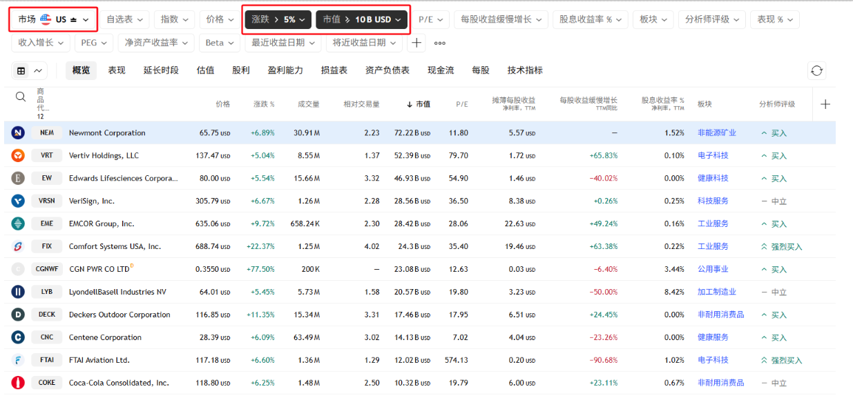 在页面上方的筛选选项中,我们可以根据一系列技术指标和基本面指标来筛选股票,也可以按地区进行分类。例如,如果我们想筛选出所有美国市场中、过去一天涨幅超过5%的大盘股,只需在筛选器中分别设置“市场”为“美国”、“涨跌幅”大于5%、“市值”选择“大盘股”,即可快速获得符合条件的股票列表。